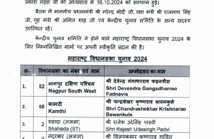 दिल्ली. भारतीय जनता पार्टी ने महाराष्ट्र विधानसभा के लिए आज 99 उम्मीदवारों की सूची जारी की इसमें मुंबई, ठाणे, रायगड जिले के निवर्तमान विधायकों को दोबारा टिकट दिया गया है. उपमुख्यमंत्री देवेन्द्र फडणवीस नागपुर दक्षिण पश्चिम से चुनाव लड़ेंगे.( BJP releases first list of candidates for Maharashtra Assembly, 13 outgoing MLAs get tickets from Mumbai)