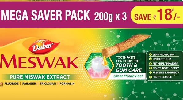 Meswak डाबर इंडिया लिमिटेड कंपनी की उत्पादक और मार्केटिंग कंपनी है. कंपनी पर आरोप है कि उसने अपने टूथपेस्ट पर ड्रग का क्लेम कर रही थी. टूथपेस्ट पर एंटी इन्फ्लेमेटरी यानी इसके इस्तेमाल से मसूड़ों के सूजन को कम करने का दावा किया जा रहा था.