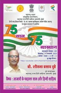 इस महत्वाकांक्षी व्याख्यान श्रृंखला की शुरुआत महाराष्ट्र राज्य हिंदी साहित्य अकादमी के पूर्व कार्याध्यक्ष प्रोफेसर शीतला प्रसाद दुबे जी के व्याख्यान से होगी.”आज़ादी के पचहत्तर साल और हिंदी साहित्य” इस विषय पर प्रोफेसर शीतला प्रसाद दुबे जी अपना व्याख्यान केंद्रित रखेंगे .