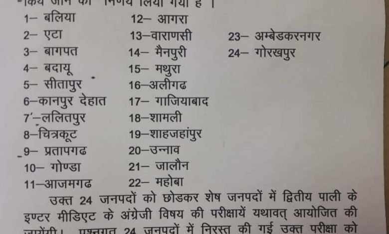 शिक्षा निदेशक विनय कुमार पाण्डेय ने शासनादेश जारी कर कहा कि 30 मार्च को बलिया जनपद में दूसरी पाली में इंटरमीडिएट अंग्रेजी विषय की सीरीज 316 ई,डी तथा 316 ई,आई प्रश्न पत्र लीक होने की आशंका में 24 जनपदों में हो रही दूसरी पाली की परीक्षा निरस्त की जाती है. एसीएस होम अविनाश अवस्थी ने पूरे मामले की विस्तृत रिपोर्ट मांगी है.परीक्षा लीक की सूचना मिलने के बाद यू पी एटीएस हरकत में आकर मामले की जांच शुरु कर दी है. पुलिस जगह-जगह छापा मारकर आरोपितों तक पहुंचने की कोशिश कर रही है.