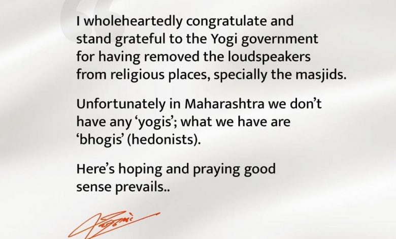 लाउड स्पीकर पर योगी सरकार द्वारा लिए जा रहे एक्शन से राज ठाकरे ने खुशी जताते हुए कहा कि उत्तर प्रदेश में योगी सरकार धार्मिक स्थलों विशेषकर मस्जिदों से लाउड स्पीकर उतार रही है. हम योगी सरकार के इस कदम का हृदय से अभिनंदन करते हैं. उनका आभार व्यक्त करते हैं.