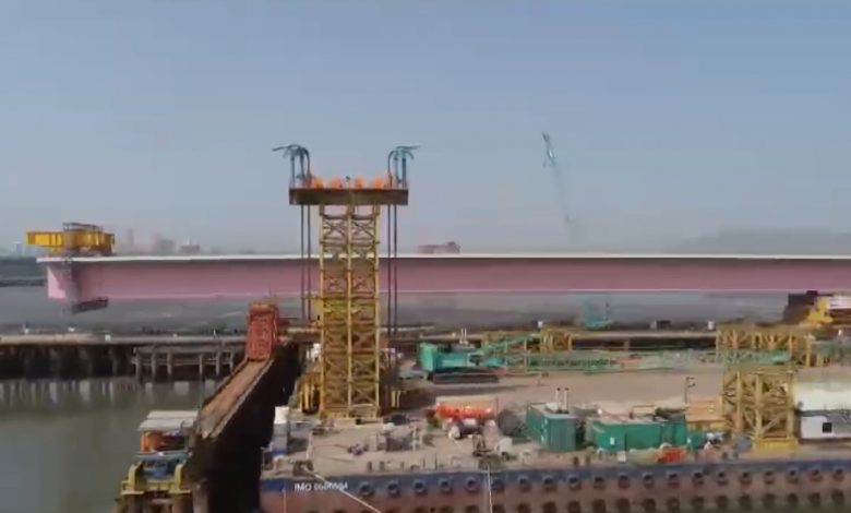 मुंबई. दक्षिण मुंबई को नवी मुंबई से जोड़ने के लिए बनाया जा रहा न्हावशेवा शिवडी ट्रांसहार्बर लिंक (Largest orthotropic steel deck mounted on MTHL) पर सबसे बड़ा ऑर्थोट्रोपिक स्टील डेक चढ़ाया गया. इस लिंक परियोजना के बन जाने से नवी मुंबई से मुंबई की राह आसान हो जाएगी. फिलहाल एमटीएचएल का काम तेजी से चल रहा है.