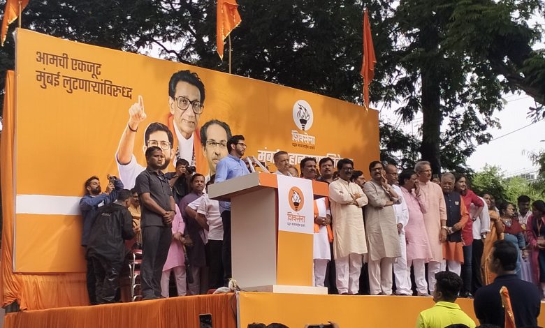 Shivsena UBT March मुंबई. खोखे सरकार आने के दबाव में मनपा प्रशासन घोटाले पर घोटाले किए जा रहा है. याद रखो हमारी सरकार आई तो एक एक पैसे का हिसाब देना होगा. घोटालेबाजों को जेल में डाल दिया जाएगा. मुंबई महानगरपालिका मुख्यालय पर शिवसेना यूबीटी के मोर्चे में आदित्य ठाकरे ने यह चेतावनी दी. (Municipal robbers will be in jail if our government comes)
